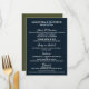 Three ai watercolor wine bottles are resting on a wooden board that has bunches of red grapes on it with vine leaves. The graphic is framed by a white square inlay edged with faux gold and pops against a forest / olive green background. The reverse is a dark blue with white templates for your custom food choices. This menu is ideal for any cheese and wine cocktail party; for a winery / vineyard / wine farm wedding or a rustic country outdoor birthday or retirement party.