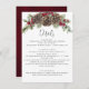 This elegant winter-themed wedding details card features a rustic bouquet of watercolor greenery and pine cones, accented with red holly berries. On the back is a burgundy watercolor texture. Find the rest of the wedding invitation suite and more matching products in the collection, or message me through Zazzle Chat if you need design tweaks or more matching products.