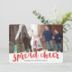 This fun holiday photo card features red watercolor hand lettered font on a crisp white background. The backside includes a coordinating red watercolor texture with holiday berries and branches.