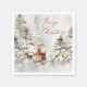 A magical winter snow scene in ethereal watercolors, this design has a red fox wrapped in a dark red winter woollen scarf sitting in a forest filled with snow covered fir trees. Vintage style handwritten typeface spells out "Merry Christmas" in matching red text. The rustic look of this scene is a wonderful choice for nature and animal lovers or for holiday celebrations with a winter snow theme.