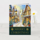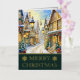 Watercolor Winter Christmas Street design with houses, christmas trees and decorations with a blue sky and snow