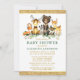 Watercolor Woodland Animals Baby Shower Invitation. Baby Animals include Bear, Deer, Moose, Racoon, Bunny Rabbit, Fox and Owl on eucalyptus leaves and forest greenery. Gold Text, Gold Glitter, Green Back.