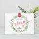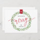 This chic, modern holiday card features a green watercolor wreath with the word "merry" written in red calligraphy lettering. The no-photo template has a blank back, where photos and/or text can be added by clicking the "Customise It" button.
