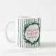 Watercolor wreath and stripe christmas holiday gift mug. Hand lettered text. A modern take on tradition red and green.