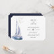 Watercolor yacht, nautical theme wedding invitation. Coordinating dark navy blue colour backing. Invitation features chic typography design style mix of calligraphy and bold type.