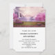 Birthday party invitation with a scenic image of a peaceful purple lake. Surrounded by lush cherry trees and waterfalls.