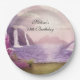 Paper plates with a scenic image of a peaceful purple lake. Surrounded by lush cherry trees and waterfalls.