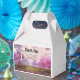 A tiny favour box with a scenic image of a peaceful purple lake. Surrounded by lush cherry trees and waterfalls.