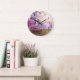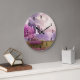 A clock with a scenic image of a peaceful purple lake. Surrounded by lush cherry trees and waterfalls.