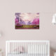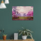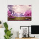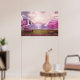 Poster with a scenic image of a peaceful purple lake. Surrounded by lush cherry trees and waterfalls.