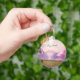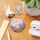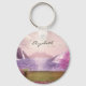 A key chain with a scenic image of a peaceful purple lake. Surrounded by lush cherry trees and waterfalls.