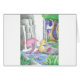 Sweet orange tabby mermaid cat with a pink and purple tail in a secluded water garden with waterfalls and frog.