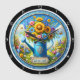 This charming round clock features a blue watering can overflowing with colourful flowers, set against a bright, cheerful garden scene. A "Welcome" sign adds a friendly touch. This whimsical clock is perfect for a kitchen, sunroom, or as a cheerful accent in any room, bringing a delightful and inviting atmosphere.