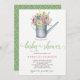 Vintage watering can with spring and summer multicolor flowers bouquet making an elegant rustic baby shower invitation. The card has a white background on the front side and a geometric pattern on sage green (editable colour) background on the reverse. It features a fancy calligraphy script and modern contemporary text lettering.-------- Ideal for an outdoor, garden spring or summer elegant country chic shower party. ------ Suitable for both boys or girls.