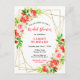 This fun and whimsical bridal shower postcard features watercolor watermelon, pomegranate, strawberries, cherries and foliage on a gold geometric frame. The text combines handwritten script and serif fonts for a stylish and modern look. This is perfect for a summer rustic bridal shower.