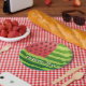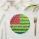 Red and green watermelon flag with stripes and seeds. Custom text.