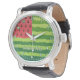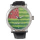 Red and green watermelon flag with stripes and seeds. Custom text.