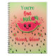 It's a beautiful and cute watermelon " one in a Melon" themed girl's 1st birthday name note book. Design features a cute and funny smiling cartoon face on watermelon 🍉 slice with cute pink bow ribbon 🎀,red green hearts 💕, watermelon seeds and pastel green on pink background. You can easily change the text and colour by clicking customisation option.