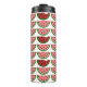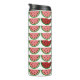 Fun design featuring a repeating pattern of watermelon slices. Most are complete and in pale pink with random ones in dark red with a bite taken out of them. Bright, bold, and definitely a statement piece. Eye-catching and unique.
