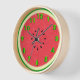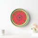 This pretty watermelon wall clock has a round fruit design that looks like it's been sliced, so the juicy pink-red flesh shows. In the middle, twelve black watermelon seeds mark the time and correspond with the twelve green clock numbers, made to look like they are carved in the berry's mottled rind. This is a cute clock for summertime or to match your whimsical decor.