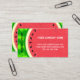 This pretty watermelon business card design has a fruit that looks like it's been sliced, so the juicy pink-red flesh of the melon shows, along with a circle of black watermelon seeds. The berry also has a speckled green, mottled rind.