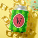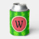 This pretty watermelon monogram foam can cooler design has a round fruit that looks like it's been sliced, so the juicy pink-red flesh of the melon shows through, along with a circle of black watermelon seeds. The berry also has a speckled green, mottled rind pattern background.