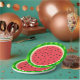 This pretty watermelon paper plate design has a round fruit that looks like it's been sliced, so the juicy pink-red flesh of the melon shows through, along with plenty of black watermelon seeds. The berry also has a speckled green, mottled rind. This is a cute, whimsical summertime design, perfect for your summer party!