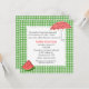 Sweet square baby shower invitation done in a green and white gingham pattern, with a square scalloped edge white text area, in the middle. Colourful graphics of a watermelon slice, decorates the bottom left corner of the invitation and an umbrella done in watermelon colours decorates the top right corner. Personalise black and salmon pink custom text to suit your shower needs. Lovely invitation the mum to be will cherish and perfect for a Summer time baby shower.
