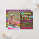 Waterslide birthday bash invitation, hot pink, purple, teal, yellow and lime colour scheme with a faux wood background suitable for any age. Add your own wording and photo into the template, to resize photo and more customisation (font colour, font style, move elements, background), click on personalise, scroll down and click on link "click to customise further".