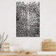 A black and white illustration of water flowing from the top of a basalt basin and into a forest filled of trees.
