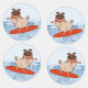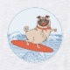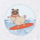 Funny animal character the happy pug riding a surf on an ocean wave
