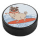Wave riding happy pug dog on surfboard hockey puck
