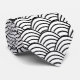 This necktie has an Art Deco design of black curved lines in a triangle shape on a field of white repeated across the design.