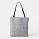 This tote bag has an Art Deco design of black curved lines in a triangle shape on a field of white repeated across the design.