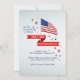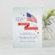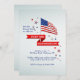 A patriotic invitation featuring a US flag with a red ribbon that reads "July 4th Independence Day". The off-white background has red and blue star bursts. Show your pride this holiday with this flag-waving invitation.The card is easy to customise with your wording, font, font colour, paper shape options and choice of six paper types.