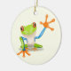 As its name suggests, the red-eyed tree frog has red eyes with vertically narrowed pupils. It has a vibrant green body with yellow and blue, vertically striped sides. Its webbed feet and toes are orange or red. The skin on the red-eyed tree frog's belly is soft and fragile, whereas the back is thicker and rougher. Red-eyed tree frogs have sticky pads on their toes.
