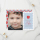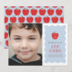 Celebrate your child's preschool graduation with this modern, charming graduation announcement. The front of the card features a sweet, halftone apple illustration with a "Class of (Year)" text overlay. Beneath the illustration is the message "the apple of our eye", as well as space for the name of your child and their school. The text and design is placed over a solid blue background, with a playful, white wavy frame border. This announcement also includes space for a large customer photo. The back of the card features a coordinating halftone apple pattern.