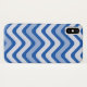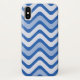 Features a beautiful pattern of blue and white waves. They are made up of curving lines, geometric forms that are entirely abstract but also inspired by the natural world. A clean and stylish design.