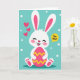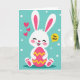 This card features a stylized white bunny 🐰 with long ears lined in soft pink and rosy cheeks, sitting with eyes gently closed and a small smile that feels like a sweet, shared moment. A tiny tongue peeks out as it cuddles a large oval egg in bright fuchsia, decorated with wavy yellow lines, as if offering it to someone special. To the right, a rounded yellow speech bubble carries the words “For you!” in darker lettering, placed near the bunny’s face like a quiet, friendly note. On the left side, three red hearts float upward, adding the look of affection between giver and receiver without needing any extra words. The background is a smooth aquamarine field sprinkled with small white dots, like confetti drifting through the air. The colors stay simple and high-contrast—white, pink, fuchsia, yellow, red, and teal—giving the scene a fresh, cheerful Easter feel 🌷. The bunny sits centered with the egg held close, while the speech bubble hovers to the right and the hearts cluster to the left against the dotted teal backdrop.