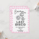 Last disco theme hen do wavy border bachelorette weekend Invite. Retro pink wave border and disco ball hen party invite with bachelorette weekend itinerary.