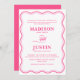 This Wavy Pink Retro Squiggle Wedding Invitation blends vibrant pink and red tones with playful curves and squiggles for a unique, retro wedding vibe. The contemporary design features stylish calligraphy, giving a fresh yet nostalgic twist to traditional wedding invitations. Perfect for couples who want a bold, wavy wedding invitation that stands out with its modern flair and retro charm.