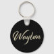 Ein sehr schöner edler personalisierter Button Schlüsselanhänger im whitegold Lettering Look auf schwarz für Waylon.