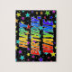 This vibrant, fun, birthday-themed jigsaw puzzle design features the message "HAPPY BIRTHDAY, WAYNE" with the characters having a colourful rainbow spectrum inspired gradient pattern, along with an exciting star field background pattern. A colourful puzzle like this might be used to send birthday wishes to somebody named Wayne. [~Z0000468]