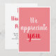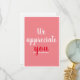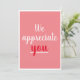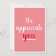 A casual "We appreciate you" card. Red and white script on pink appreciation card that you can make personal with a nice gesture from the company boss, co-workers or anyone. Just use the "personalise this template" feature to edit the text to make it your own. Other paper styles available.