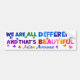 Inspirational quote of “We Are All DIFFERENT And That's BEAUTIFUL” with unique Autism puzzles, and colourful butterflies flying on the background to support and advocate Autism Awareness.