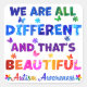 Inspirational quote of “We Are All DIFFERENT And That's BEAUTIFUL” with unique Autism puzzles, and colourful butterflies flying on the background to support and advocate Autism Awareness.