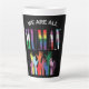 Social justice themed design features multi-colour "We are all human" text and hands representing the LGBTQ community