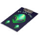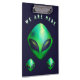 Cool fun clipboard with a printed image of 3/three green alien heads on a very dark blue background, with a caption/phrase which reads "WE ARE HERE"