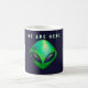 Cool fun mug with a printed image of 3/three green alien heads on a very dark blue background, with a caption/phrase which reads "WE ARE HERE"