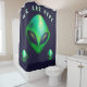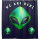 Cool fun shower curtain with a printed image of 3/three green alien heads on a very dark blue background, with a caption/phrase which reads "WE ARE HERE"